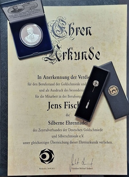 Der Geschäftsstellenleiter Horst Teuscher gratuliert dem langjährigen Obermeister der Innung Halle, Jens Fischer, zum 60. Geburtstag und zur "Silbernen Ehrennadel" des Zentralverbandes und bedankt sich im Namen des Zentralverbandes für sein persönliches Engagement für das Gold- und Silberschmiede-Handwerk.