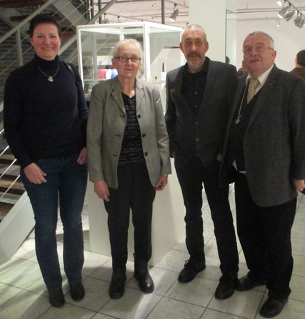 Foto: v.l.n.r. Barbara Ziegler, Jutta Arndt (Staatspreisträgerin 2004), Günther Meyer (stellv. Obermeister), Hans J. Wiegleb trafen sich vor den Ausstellungsvitrinen in der Handwerksform Hannover