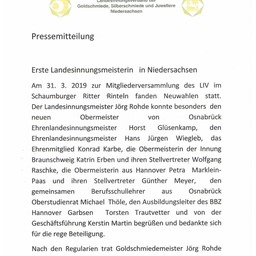 Am 31.03.2019 fand die Mitgliederversammlung des Landesinnungsverbandes der Goldschmiede, Silberschmiede und Juweliere Niedersachsen statt. Nachfolgend dazu die Pressemitteilung.