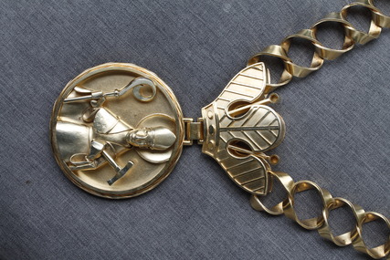 Die Obermeisterkette ist gefertigt aus vergoldetem Silber. Das Motiv ist der heilige Eligius, Schutzpatron der Goldschmiede, als Medaillon plastisch gearbeitet und an einer handgefertigten Hobelspankette montiert. Entstanden in den 50-iger Jahren, entworfen und gefertigt von den Münchener Goldschmieden und Schullehrern Goldschmitt und Klein.