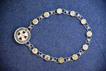 Die Kette wurde ehrenamtlich, von den verschiedenen Mitgliedern angefertigt, die sowohl das Material als auch die Arbeit gestiftet haben. Die Wappen sind aus 750/00 Gold mehrfarbig gefertigt. Die Grundglieder bestehen aus Sterlingsilber.