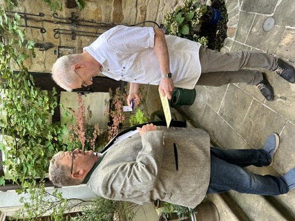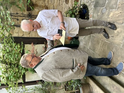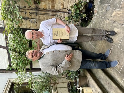 Der Geschäftsstellenleiter Horst Teuscher gratuliert dem langjährigen Obermeister der Innung Halle, Jens Fischer, zum 60. Geburtstag und zur "Silbernen Ehrennadel" des Zentralverbandes und bedankt sich im Namen des Zentralverbandes für sein persönliches Engagement für das Gold- und Silberschmiede-Handwerk.