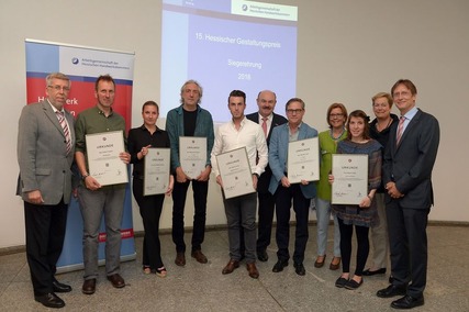 Auf dem Bild Herr Jahr ( 5. von rechts ), bei der Preisverleihung im Museum für Angewandte Kunst Frankfurt am Main mit den übrigen Preisträgern und Vertreter/innen von der Handwerkskammer Wiesbaden und vom Hessischen Ministerium. Bild Wachendörfer