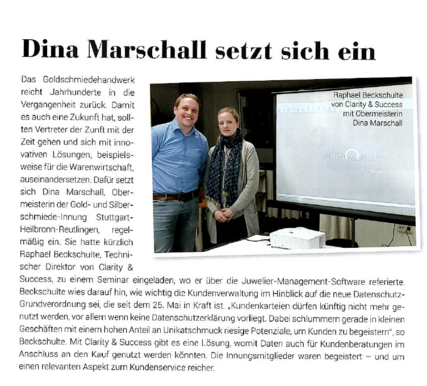 Die GZ berichtet in der Ausgabe vom Juni 2018 über die Obermeisterin der Gold- und Silberschmiede-Innung Stuttgart-Heilbronn-Reutlingen, Dina Marschall.
