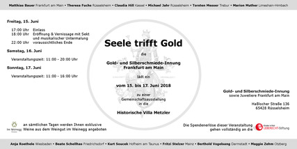 Diesen Glanz bringen 12 Goldschmiede der Gold- und Silberschmiede-Innung Frankfurt am Main vom 15. – 17. Juni 2018 in die stilvollen Räume der Historischen Villa Metzler. Und dies nicht zum ersten Mal. 2016 war die erste öffentliche, erfolgreiche Ausstellung von exklusivem Unikatschmuck zum Thema „Seele trifft Gold“. Auch dieses Jahr hat wieder jeder Goldschmied ein passendes Unikat oder Objekt zum Thema „Seele trifft Gold“ gefertigt, welches die Besucher zum Staunen und Nachdenken inspirieren soll. Weitere Werke aus den jeweiligen Kollektionen der Goldschmiede - ob Gelbgold oder Weißgold, Silber oder Platin kombiniert mit Diamanten, Farbedelsteinen oder anderen außergewöhnlichen Materialien - zieren an diesem Wochenende die Vitrinen in der Historischen Villa Metzler. Hier werden Sie sicherlich Ihr neues Lieblingsstück entdecken – ob Ohrring, Kette oder Ring. Der offizielle Empfang findet am Freitag um 18 Uhr statt.