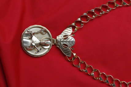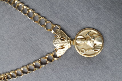 Die Obermeisterkette ist gefertigt aus vergoldetem Silber. Das Motiv ist der heilige Eligius, Schutzpatron der Goldschmiede, als Medaillon plastisch gearbeitet und an einer handgefertigten Hobelspankette montiert. Entstanden in den 50-iger Jahren, entworfen und gefertigt von den Münchener Goldschmieden und Schullehrern Goldschmitt und Klein.
