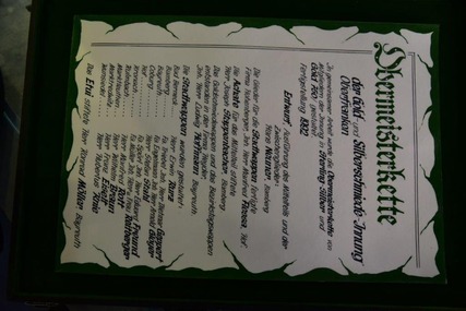 Die Obermeisterkette der Uhrmacher-, Gold- und Silberschmiedeinnung, in Rechtsnachfolge der Goldschmiedeinnung Oberfranken entstand in den Achtziger Jahren, nachdem das Original im 2. Weltkrieg verschollen war. Leider gab es auch keinerlei Abbildungen. Der damalige Obermeister Neuner hat dann den Entwurf für die neue Kette gefertigt.